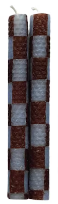 Set of 2 hand-rolled beeswax taper candles with a checkered pattern. Perfect for entertaining or giving as a gift.