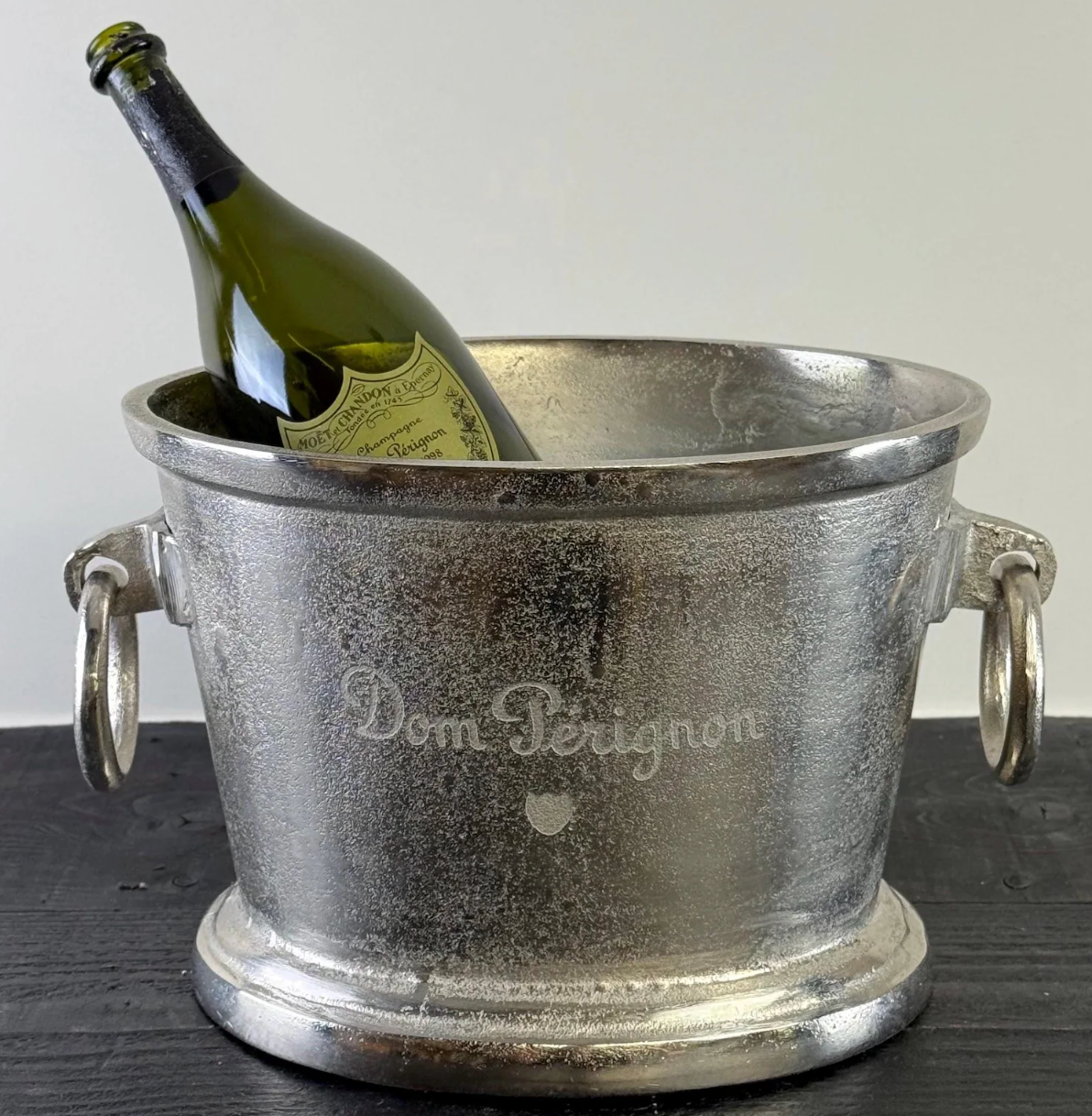 Oval ring handled cooler is engraved “Dom Pérignon” on the front.
